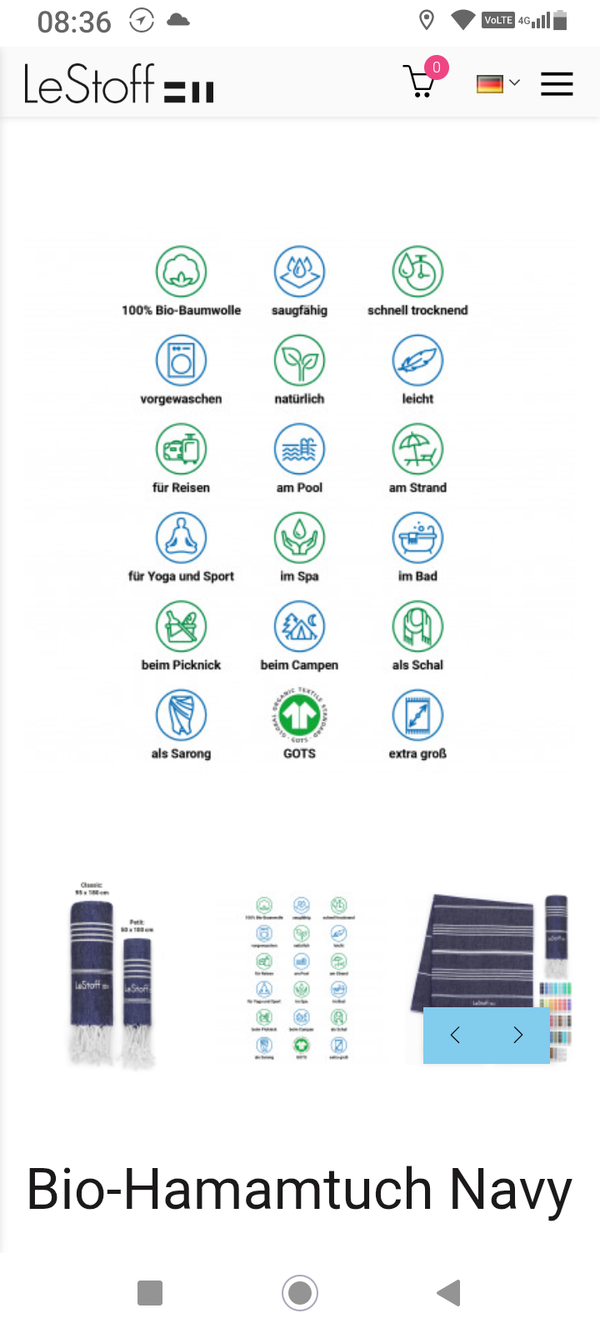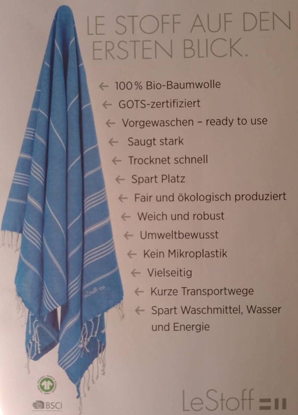 100% gekämmte Bio-Baumwolle, flach gewebt95 x 180 cm, 300 g, farbecht, waschbar bis 60° CDas Tuch ist GOTS-zertifiziert und vorgewaschen, und somit zum sofortigen Gebrauch geeignet.Ca. 1/3 des Gewichts eines Frotteehandtuchs, aber gleich saugstark, zudem schnell trocknend, platzsparend, leicht, vielseitig, robust, unisex, praktisch, 100% natürlich und ökologisch… immer dabei!Praktisch für Strand, Bad, Reisen, Sport, als Pareo, Schultertuch, Deko und vieles mehr.Weniger Energie- und Waschmittelverbrauch, umweltschonend in Produktion und Gebrauch, nachhaltig, fair, vegan, hautfreundlich und hygienisch.