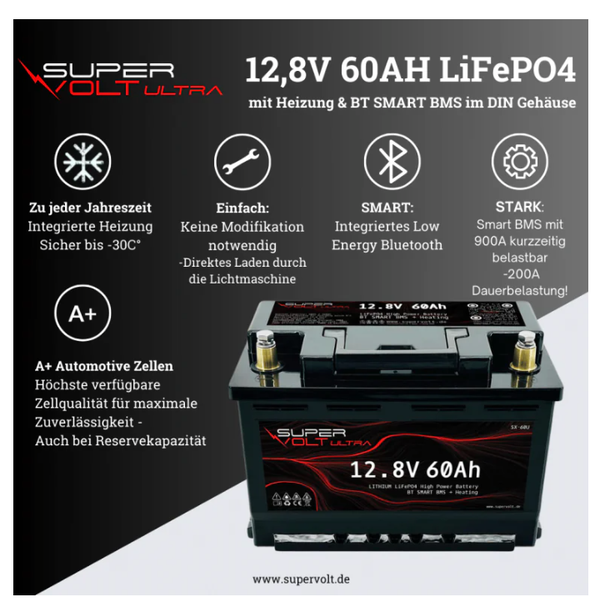 Supervolt Ultra – 12,8V 60Ah, 100Ah oder 150Ah High Power LiFePO4 Hochleistungsbatterie mit Bluetooth, Heizung und integriertem Balancer
