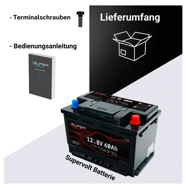 Unsere 60ah, 100ah oder 150ah Supervolt Ultra Hochleistungsbatterie ist ein Kraftpaket voller innovativer Technologien. Mit einem Gewicht von nur 6,5kg stellt diese 12,8V 60Ah High Power LiFePO4 Batterie eine signifikante Gewichtsersparnis gegenüber herkömmlichen Bleibatterien dar.