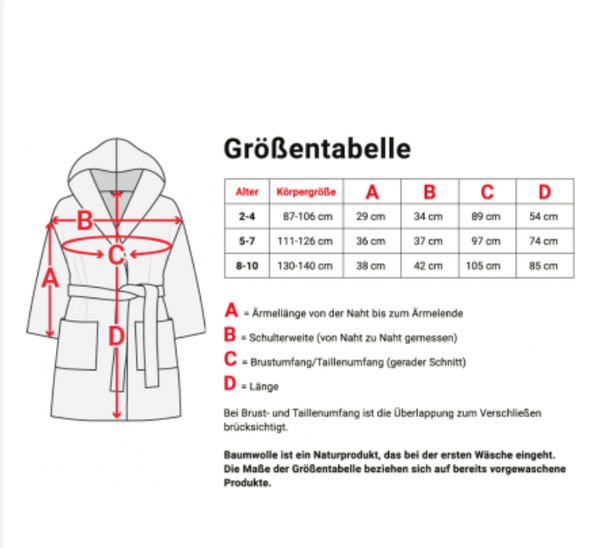 Bitte beachten Sie die Größentabelle genau!100% hochwertige gekämmte Bio-Baumwolle, flach gewebt.GOTS-zertifiziert und vorgewaschen, und somit zum sofortigen Gebrauch geeignet.In den Größen passend für die Altersklassen 2-4, 5-7, und 8-10 erhältlich, farbecht, waschbar bis zu 60° C.Der LeStoff Bademantel ist ein Leichtgewicht bei höchstem Tragekomfort in eleganten Farben mit einem lässigen und zeitlosen Look.Saugstark, schnell trocknend, platzsparend, unisex, praktisch, 100% natürlich.Weniger Energie- und Waschmittelverbrauch, umweltschonend in Produktion und Gebrauch, nachhaltig, fair, vegan, hautfreundlich, hygienisch.
