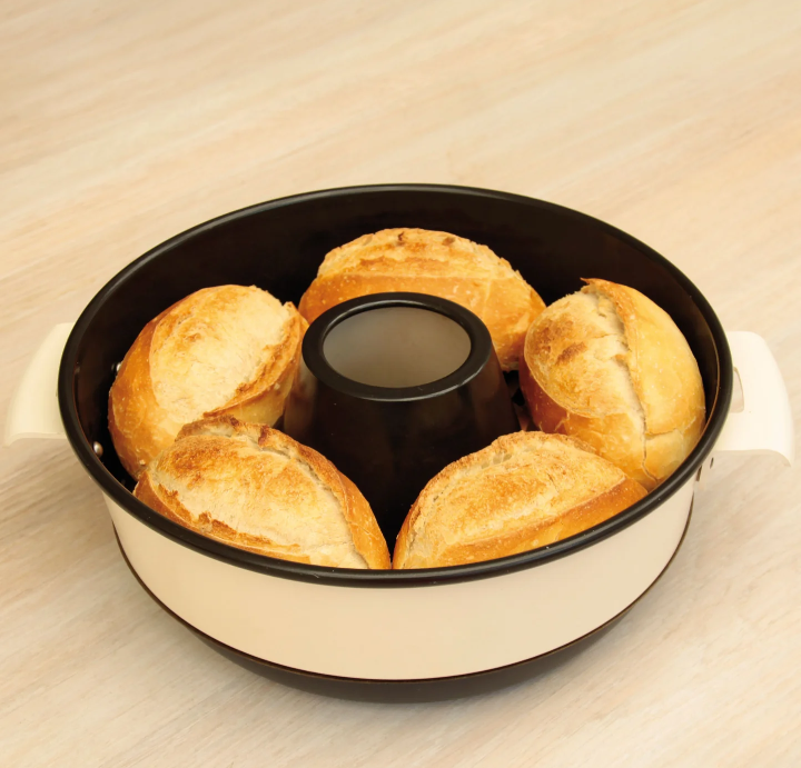 Er besteht aus drei Teilen, die zusammen Ober- und Unterhitze erzeugen. Die Backform ist aus extra verstärktem Aluminium, um den Anforderungen des täglichen Gebrauchs gewachsen zu sein.